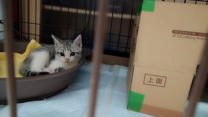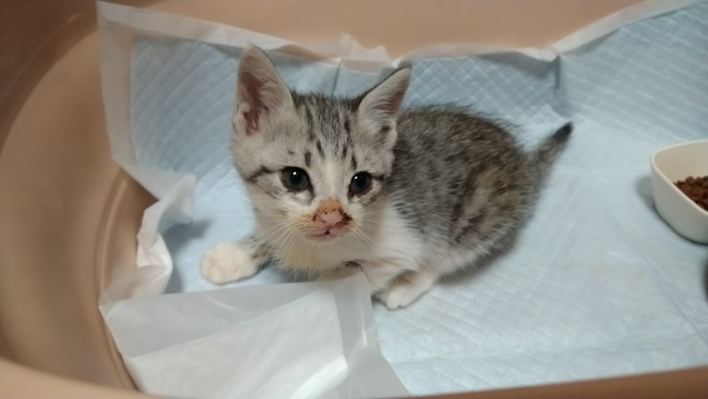 | 特徴(性格など) | 縞三毛の男の子だと思われます。 9月22日の午前中に道路で倒れている子猫を2匹発見し、保護いたしました。 車にひかれてしまったようで、1匹は残念ながら亡くなっていましたが、もう1匹は意識があり、その日のうちに動物病院を受診し、応急処置をして頂きました。 9月22日の受診では… ・左脇下に裂傷あり→縫合済み ・鼻血が止まらず ・左目も閉じたまま その他に関しては、異常なしですが 頭を強く打っているとのことで、麻痺や後遺症が残る可能性があるとのことでした。 9月24日の受診では… ・鼻血は止まっている ・猫風邪をひいている ・左目の目やにが酷く、洗浄してみると結膜炎が酷い ・ノミがいる→投与済み ・検便する限りでは、お腹の虫はいない 事故による異常は、特に見られず ノミや猫風邪、目やにに関しては、投薬で治療することになりました。 まだ、状態が安定していないため 1回目のワクチン接種などは、まだ出来ておりません。 将来的には、ワクチン接種もしていく予定です。 (10/6更新) 10月1日の受診では… ・猫風邪症状が改善されている →再発防止も兼ねてあと2週間は投薬 ・左腕の縫合について →2週間後に抜糸予定 ・体重も順調に増えている ・便が緩く、思いのほか黒いので、腸などで出血してる可能性あり →こちらも引き続き2週間投薬 その他については、今の所問題なし。 |