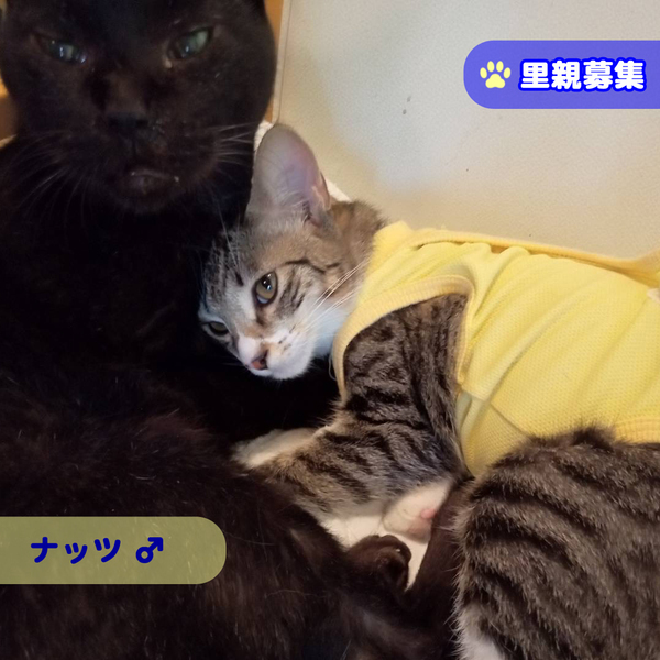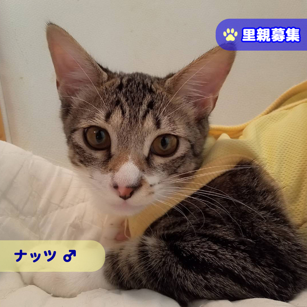 | 里親募集する理由 | 兄弟で保護されたのですが、残念ながらもう1匹は虹の橋を渡ってしまいました。 だから、他の猫に甘えるのかもしれません。 ナッツくんをたくさん可愛がっていただける里親様を探しています。 |