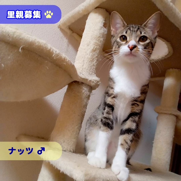 | 特徴(性格など) | 〇キジ白とサバ白がミックスした不思議な被毛 〇しっぽは、とても長くてまっすぐ 〇性格 おもしろカワイイマイペース! 人慣れはしていて、人見知りもしませんが、人に甘えたいという気持ちはあまりないみたい… でも、猫は大好き! 一緒にいる猫にはすりよっていきます。 猫が大好きなナッツくんは、16歳の黒猫サスケじいちゃんやしろちゃんにもベッタリ! 先住猫さんさえ許してくれれば、猫団子がみられるかもしれません!! 詳しくはこちらをご覧ください https://ameblo.jp/mil25mir/entry-12698638570.html |