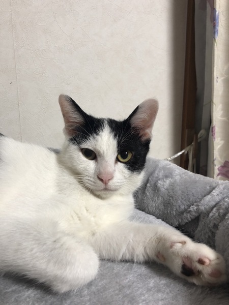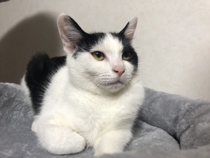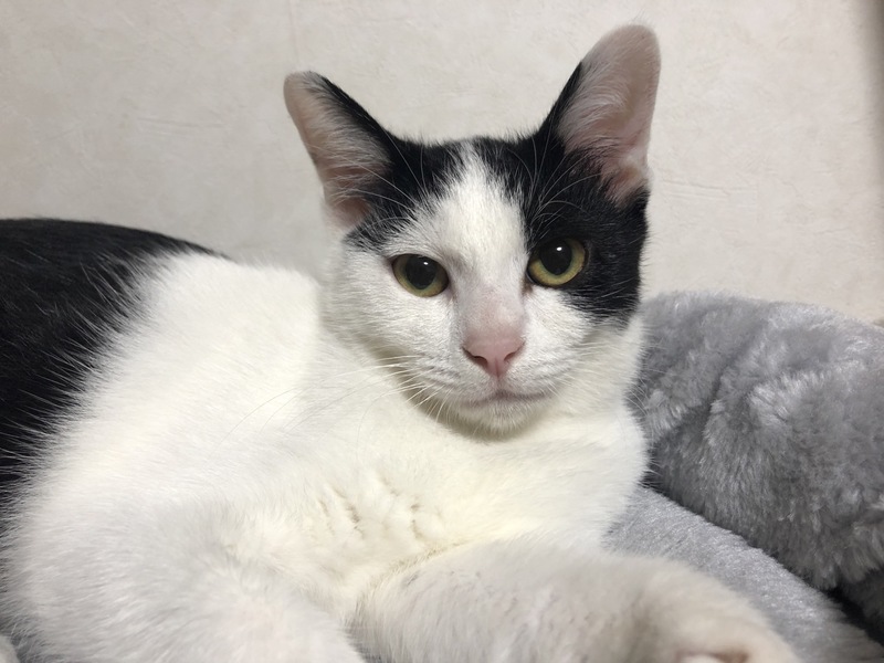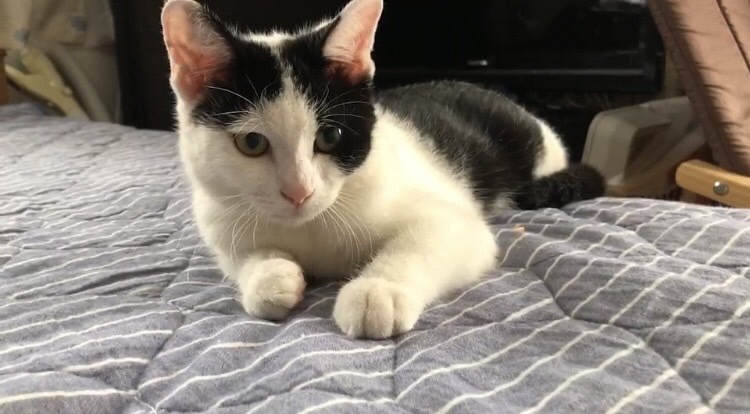 | 特徴(性格など) | 綺麗に中央で分かれたハチワレが可愛い仔猫です。 やっと人慣れしてきました。 先住猫ちゃんともすぐ打ち解けて遊ぶ明るい性格の子です。 にゃーとよくおしゃべりしてくれます。 黒の長い尻尾をピン!と立てて走り回っています。 |