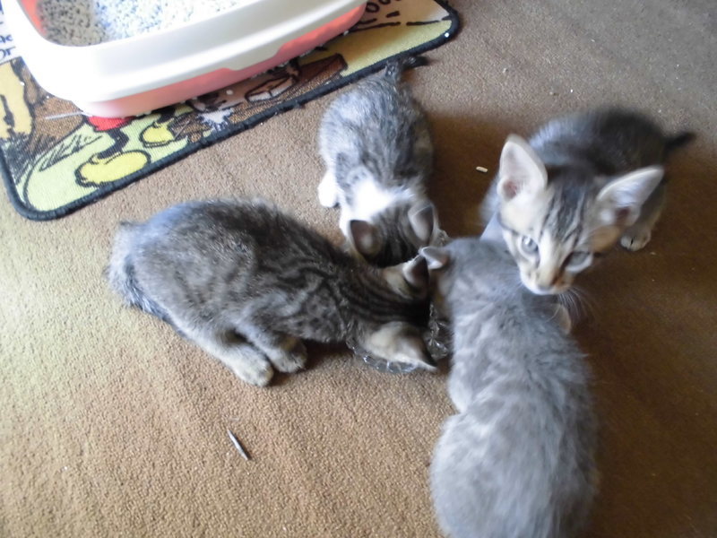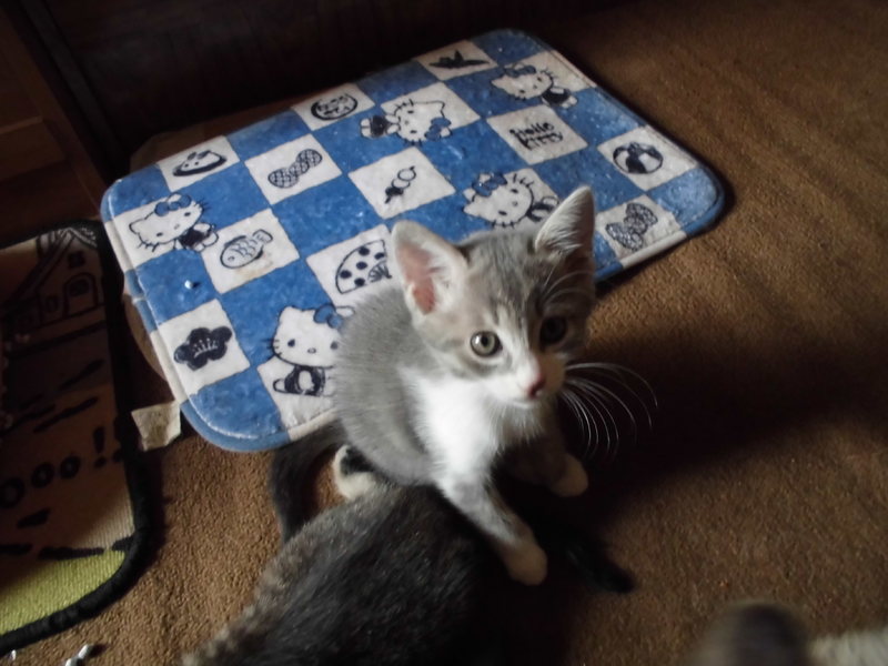 | 特徴(性格など) | 黒トラ2匹、三毛1匹、グレー2匹で内1匹がメス後はオスです。元気にして遊んでいます。最近、カリカリとチュールも食べてます。トイレを教えていますがまだまだですね。 | ||