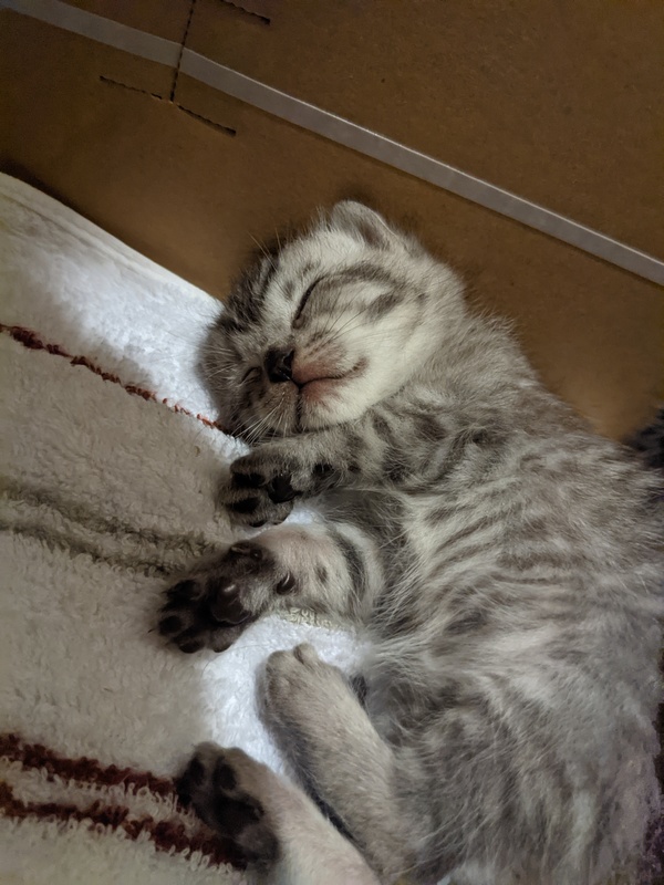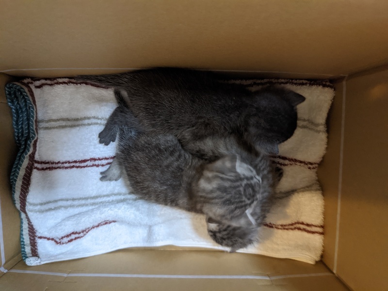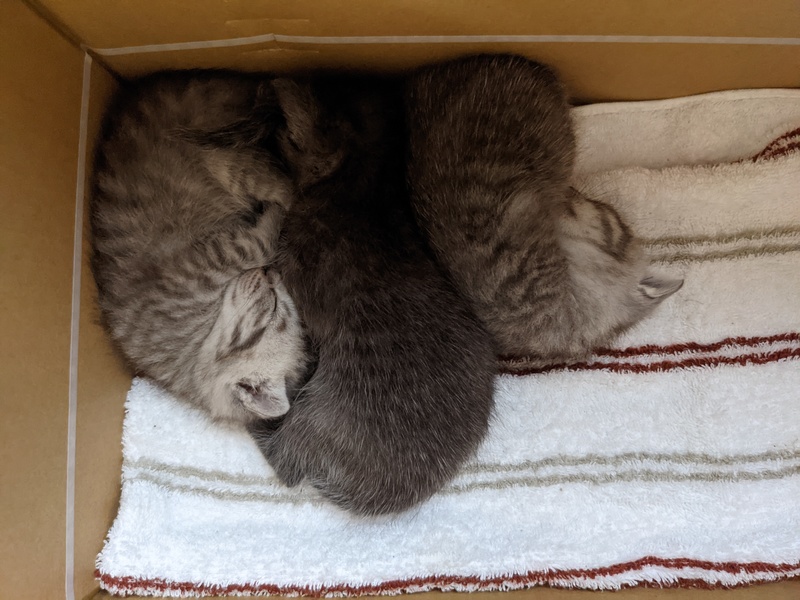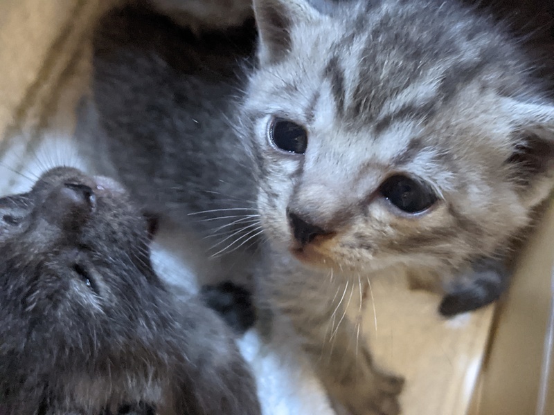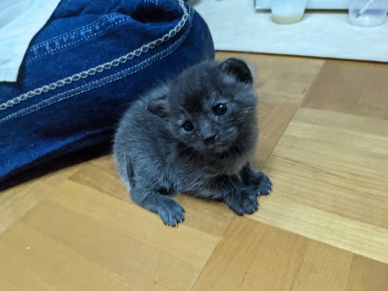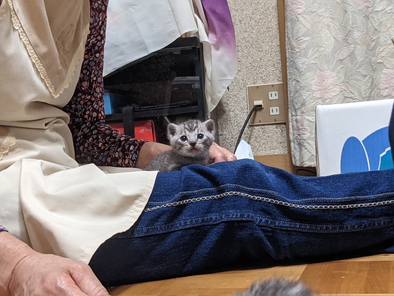 | 特徴(性格など) | 何れもサバトラ 1匹目♂ 黒(うっすら模様あり)。やや目ヤニあり 2匹目♂ グレー 3匹目♀ やや明るいグレー 現在大きさは、片手に乗る程です。 おそらく生後2、3週間程度。 |