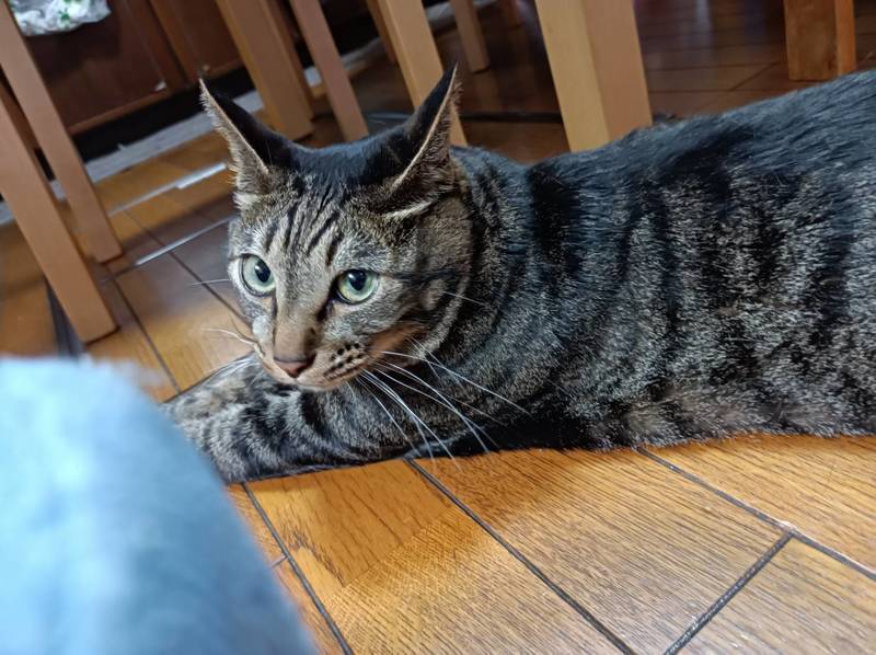 | 特徴(性格など) | 茶虎柄の人懐っこいオス猫ちゃんです。カラスに襲われていた所を助けました。 物凄く甘えたで、爪も立たず人添い寝も大好きです。膝の上に乗ってゴロゴロ言います。 |