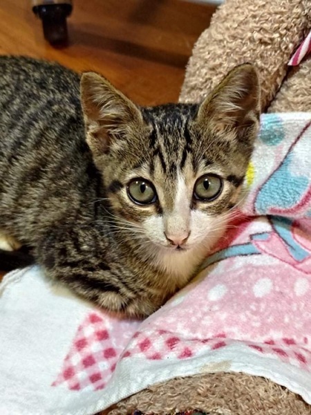 | 特徴(性格など) | 前足に靴下を履いたキジトラちゃん。あんなにビビってたのに、すっかり慣れてスリスリゴロゴロフミフミ❤が止まらない甘えんぼさんに変貌しました。 とても大人しくて賢い子。お留守番も大人しく出来ていました。人懐っこく、呼んだら返事をしてくれます(^^)ずーっと私のそばにいて、くっついてくるんですよ。そして、ずーっとぐるぐる言ってます? |