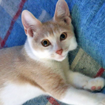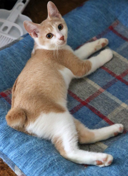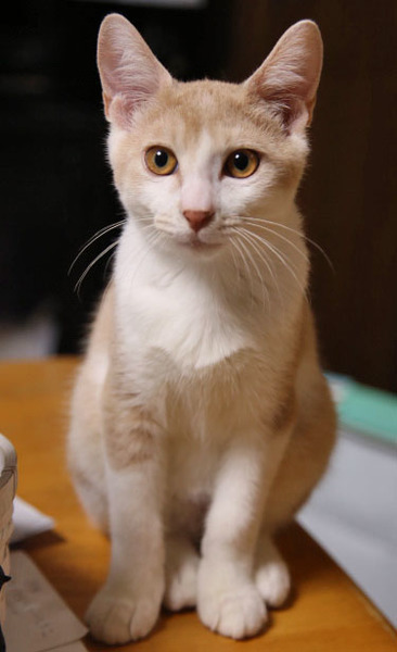 | 特徴(性格など) | ちんまりムチっとしたボディにうさぎのようなしっぽ(ボブテイル)の「つぶ」です。 アイボリーと白のバイカラーがほんわか柔らかな印象ですが、中身は活発な体育会系男子です。 子猫たちのにゃんプロレスや追いかけっこはいつもつぶが優勢です。 甘えん坊で抱き上げるとゴロゴロ大音量が止まりません。 両手でフミフミしながら全身脱力して身を委ねます。いつまでも抱っこしてもらいたいタイプです。 健康状態良好、食事の好き嫌いもなくドライもウェットも完食します。 いつまでもお皿を舐めてピッカピカにしてくれます。 今は「やんちゃ坊主!」とあだ名がつくほど元気です。 何でもおもちゃにする遊びの天才! 食べ物にも興味があるので食卓やキッチンカウンター、登れるところはどこへでも上がって物色します。 元気な証拠!と受け止めてくださるご家族様に見つけていただけますように。 まだまだ遊び盛りなので一緒に遊べる若い先住猫さんがいるご家庭または 我が家で仲良くしている子達も募集しておりますので一緒にご縁がつながると嬉しいです。 |