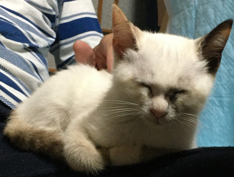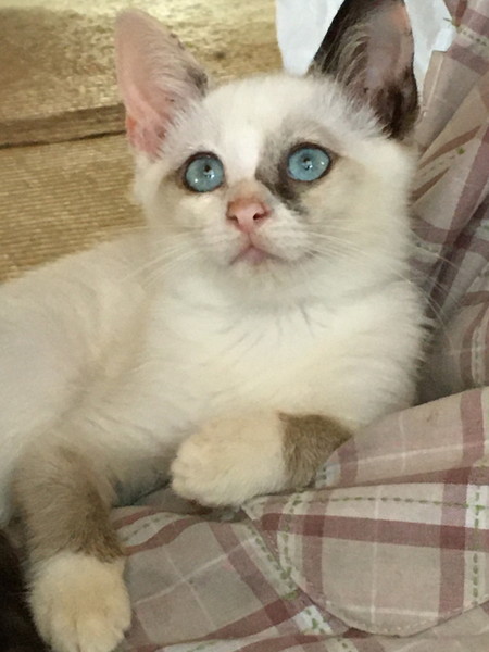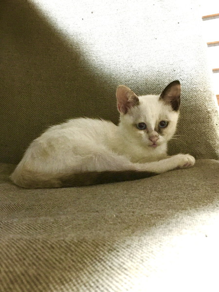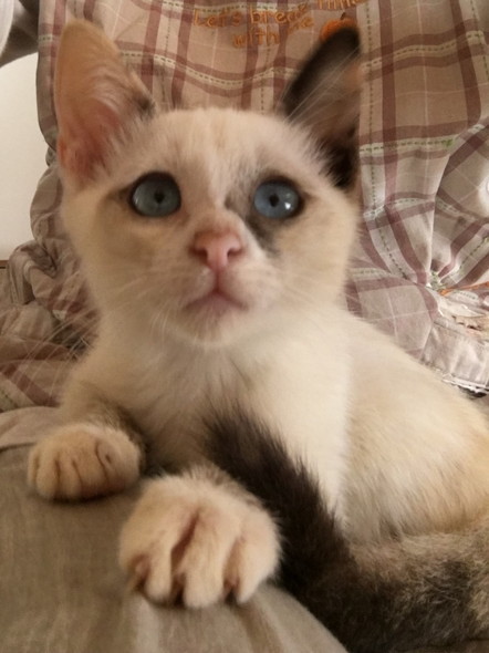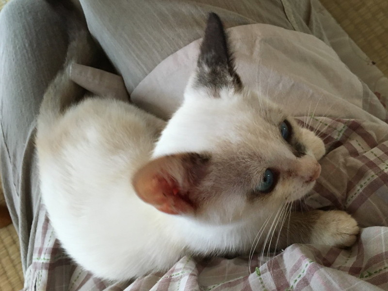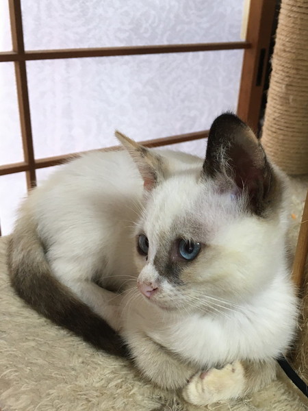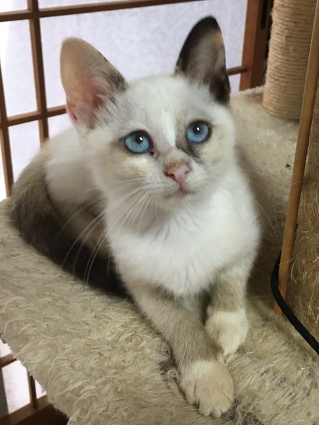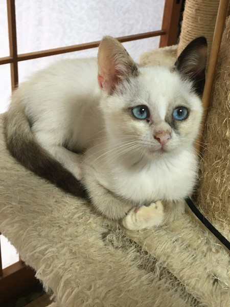 | 特徴(性格など) | シャムちゃんとのミックスのようですが、顔の模様がビジュアル系のようです。 目も綺麗なブルーで、体形もスレンダーでしなやかで綺麗です。 性格は優しく少し臆病なところがありますが、ずいぶん人に慣れてきて膝で寝たりも出来るようになりました。 一緒にいる保護猫とも仲良く遊びます。 8月1日辺りに生まれたと推測されます。 |