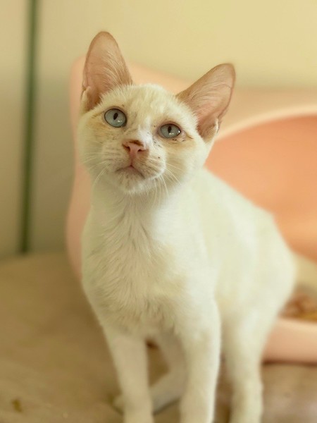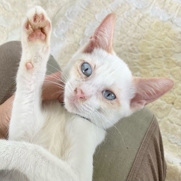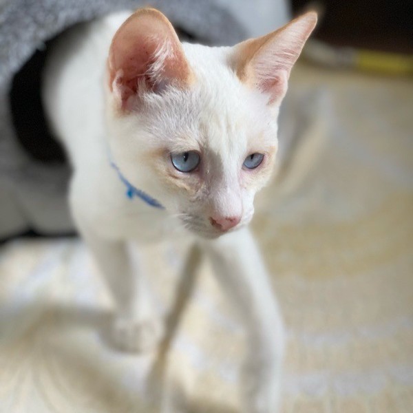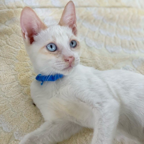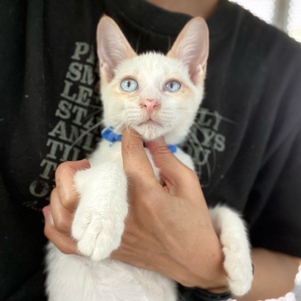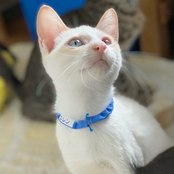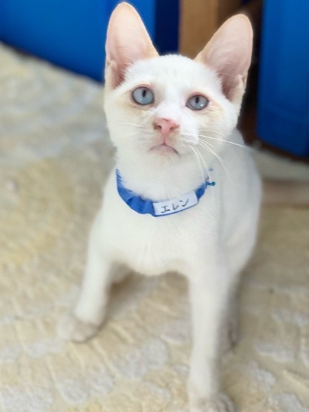 | 特徴(性格など) | 抱っこ大好き「エレン」くん❤ 目の周り、シッポと耳に茶色毛♪ 誰かとくっついて眠るの大好き♪抱っこされるとされるがままの穏やか甘えん坊です。 現在、ドライフードを24時間の置き餌として、一日3回のパウチを与えています。 <推定誕生日:6月始め> |
