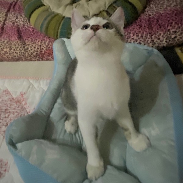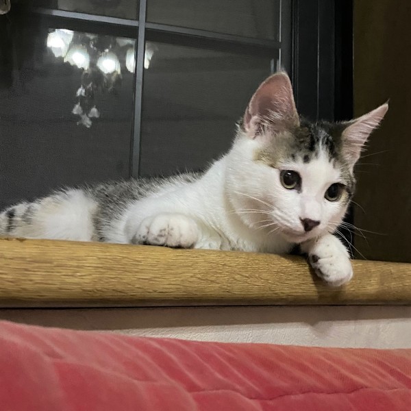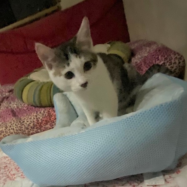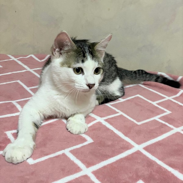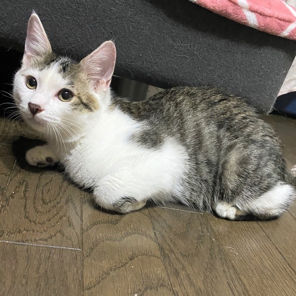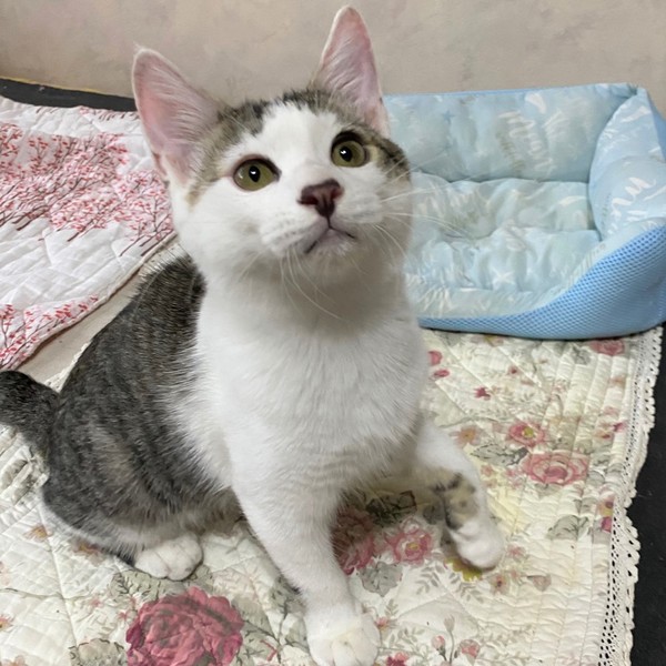| 特徴(性格など) | 仮名、テテ まん丸顔・短い前髪が可愛いきじ白男の子 優しい男の子です。 ちょっと控えめな性格ですが、撫でられるの大好き。 ねこじゃらしも好きで、兄妹の「ミミ」と、一緒に元気に仲良く遊んで過ごしています。 ねこじゃらしを咥えて走ります。 ご飯の時間が来ると「僕のごはんはまだですか・・・?」と、ほてほてやって来ます。 |