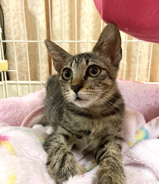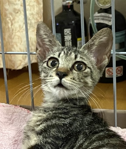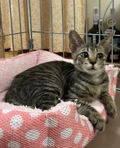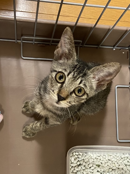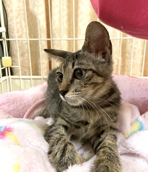 | 特徴(性格など) | 3ヶ月ぐらいのキジトラのおっとりした優しい女の子です。 人馴れしてます。 威嚇パンチは全くありません。 全体的にキジトラの縞模様がはっきりしています。 お顔が小さいので、ちょっぴりお耳が大っきく見えますが、お目々ぱっちりでかわいいお顔しています。 甘えん坊で抱っこも出来ます。 トイレフード問題なし。いいウンチしてます。 先住猫ちゃんとも仲良く出来る子です。 |