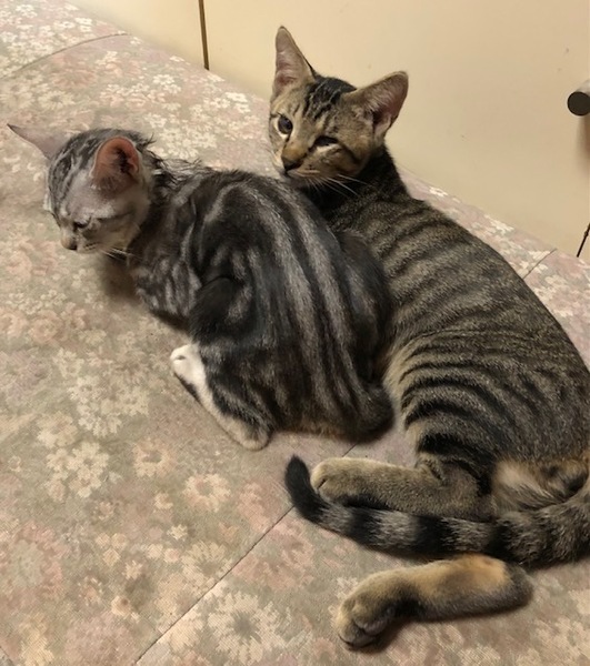 | 里親募集する理由 | 大雨の中、水たまりで水に浸かって死にかけている子猫を2匹保護しました。2匹ともその時から、片目が化膿して失明状態でした。保護した当初は、瀕死の状態でしたが、今では.目の不自由さを感じさせない位、2匹で元気いっぱいに走り回って遊んでいます。当方では、既に数匹の猫を飼っており、先住猫との共存が難しいため、里親さんを募集することに致しました。 | ||