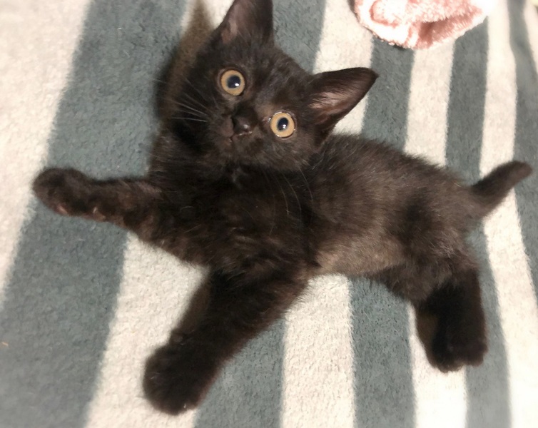 | 特徴(性格など) | お腹とシッポの裏に白い被毛が混じるマーブル模様・黒い女の子 大きなクリクリの目・甘えん坊な性格です。 目が合うとゴロゴロ・抱っこでゴロゴロ~ 眠る時は顔の横でふみふみしなから眠ります。 |