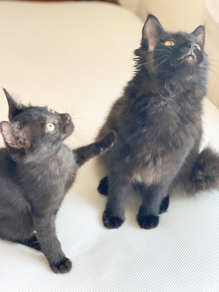 | 特徴(性格など) | *特徴 短毛独特の艷やかな毛質の黒猫ちゃんです。尻尾は真っ直ぐです。 まんまるなおめめがチャームポイントで、スリムな体型といい、魔女の宅急便のジジにそっくりです! *性格 とにかく甘えん坊。人も猫さんも大好きです。目が合うと大喜びで駆け寄ってきてくれます。 会いたかったオーラを全身で表現してくれています。 めちゃめちゃカワイイのですが、すぐに近づいてきてくれるので、写真撮影に苦労しました(汗) 日中は先輩猫さんに、夜は人間にぺったりくっつきたがる甘えん坊くんなので 時々先輩猫さんが避難しています。 ↑ 割と諦めはよくて、すぐに一人で遊んだりお昼寝したりするお利口さんです。 まだ月齢がかなり幼いこと、とにかくひっつき虫の甘えん坊さんな性格であることから 一緒に遊べる先住猫さんのいらっしゃるお宅か、2頭同時に迎えてくださる方を優先させてください。 よろしくお願いいたします。 |