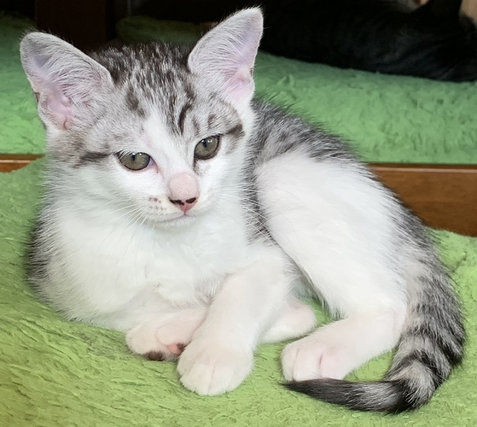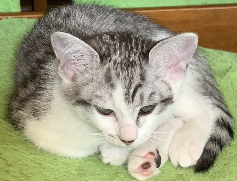 | 特徴(性格など) | 顔の模様がちょっと特徴的な?女の子です。 マイペースですが好奇心はあります。 猫缶、カリカリフード、ちゅ〜るも食べられます。猫砂トイレも出来ています。 |