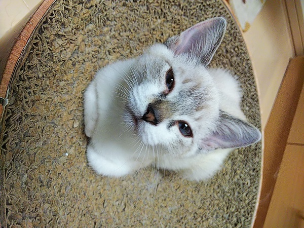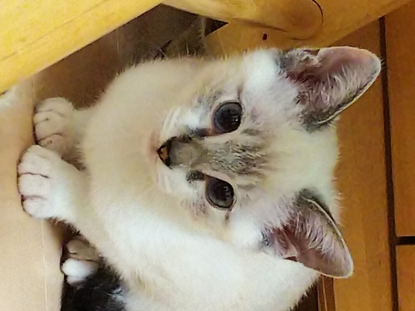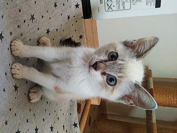 | 特徴(性格など) | 野良母猫から生まれ、外をうろうろしている所を保護しました。野良母猫は捕獲し避妊手術済です。 シャム系トラ猫、青い目(若干緑が入っています)カギ尻尾。 おくびょうな性格で慣れるまで時間がかかるかもしれませんがとっても可愛いです。 保護時、長期間下痢をしていたためか直腸が肛門から数㎝飛び出ていたのですが、獣医さんに治療していただき、現在は完治しております。 |