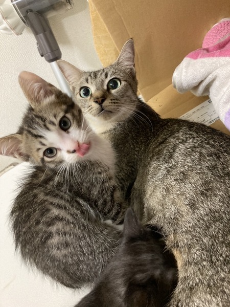| 特徴(性格など) | 一枚目が女の子のめい(仮)と二枚目が男の子のかんた(仮)です。 めいは猫好きのようで、保護した子にも威嚇することがありません。また、猫らしい性格で、一緒に寝てくれますが、抱っこは苦手なようです。 かんたは少しビビりで甘えん坊さん。抱っこされてなでなでさせてくれます。 |