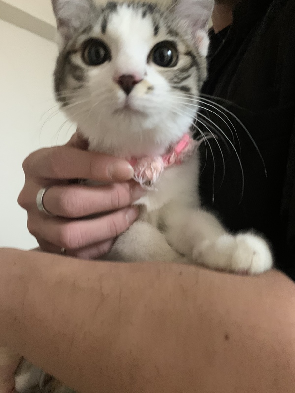 | 特徴(性格など) | ハチワレで、色はグレーと茶色が混ざってる感じです。お目目がパッチリしてます。 性格は人懐っこい反面、かなりビビリです。怪我をさせる恐れがありますので、正直多頭飼してる方には不向きかも知れません。 |