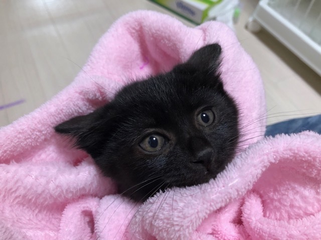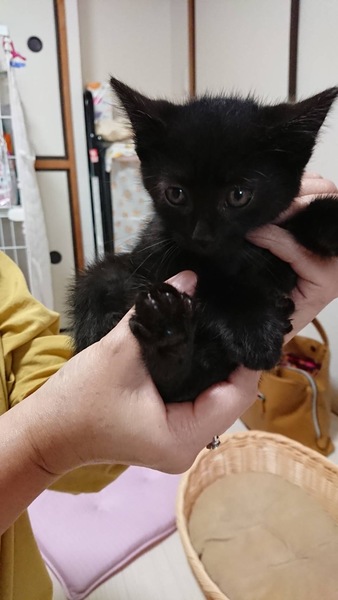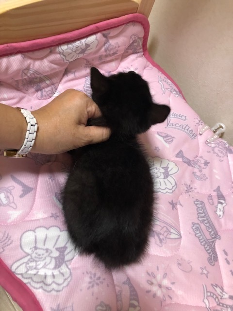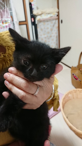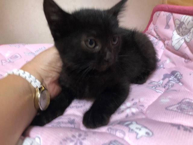 | 特徴(性格など) | 仮名:クックちゃん(黒猫・短尻尾) 初期医療:済み ウイルス検査:陰性 3種混合ワクチン接種:済み 検便・ノミダニ駆除薬:済み 10月4日:800g とても可愛い黒猫仔猫で、兄弟で保護しました。 保護したは1.5ヶ月くらいでしたが、食欲もありよくフードを食べています。 活発でよく遊び、ナデナデ抱っこも大好きです。 まだ小さな仔猫なので、兄弟一緒か先住猫さんのいるお留守番の少ないお家を希望します。 |