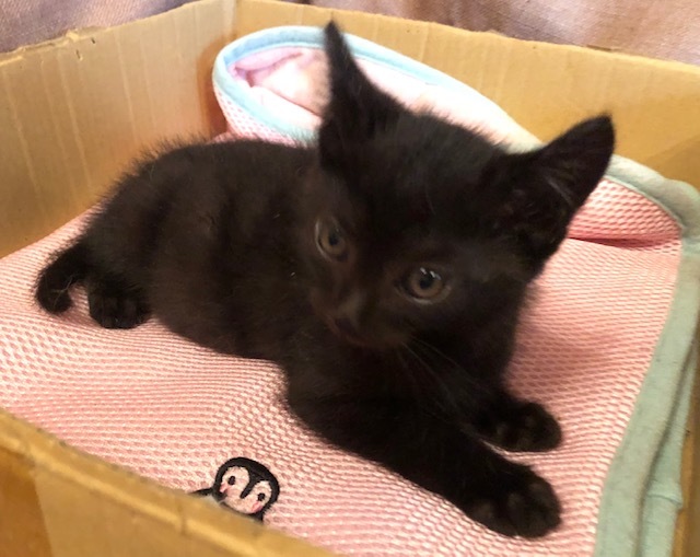 | 特徴(性格など) | 仮名:ジョーちゃん(黒猫・長尻尾) 初期医療:済み ウイルス検査:陰性 3種混合ワクチン接種:済み 検便・ノミダニ駆除薬:済み 10月10日:780g とてもキュートな黒猫仔猫です。 10月9日に保護しましたが、推定1.5ヶ月くらいです。 とても甘えん坊で、ナデナデ抱っこも大好きです。 まだ小さな仔猫なので、兄弟一緒か先住猫さんのいるお留守番の少ないお家を希望します。 |