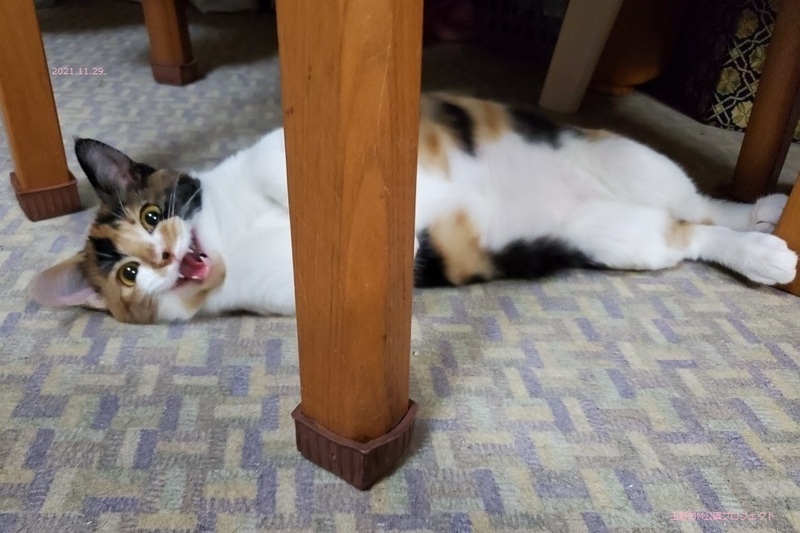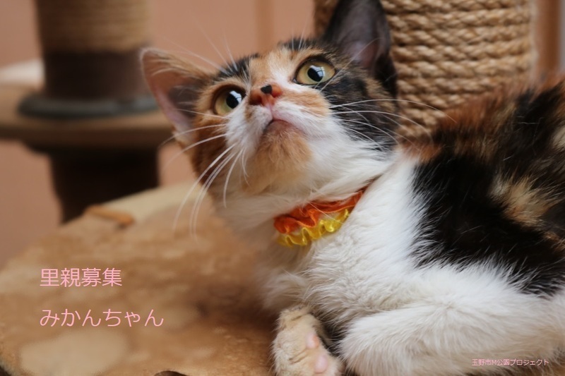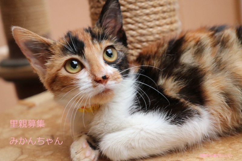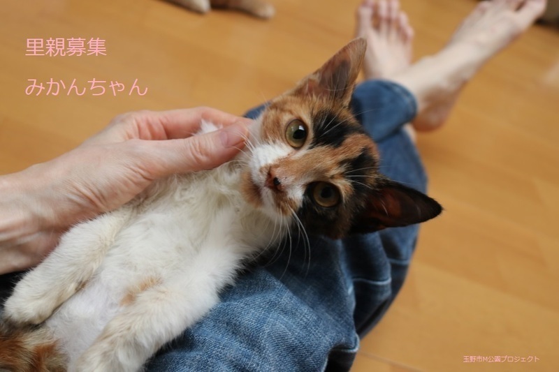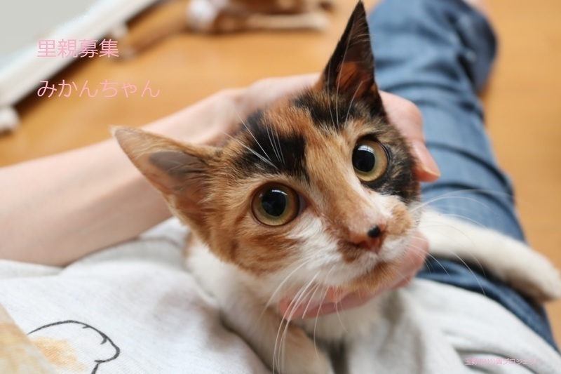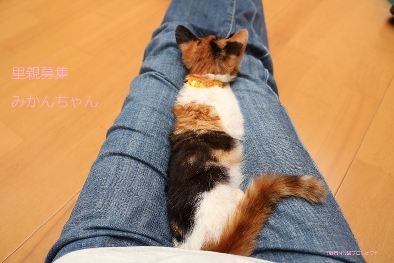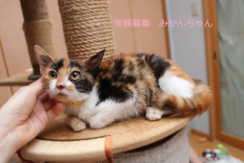 | 特徴(性格など) | 三毛子ねこ、女の子、仮名:みかんちゃん 推定生後3か月くらい、体重:1.1Kg(10/11現在) 健康診断済み、駆虫済み、フロントラインスプレー(10/9)、 血液検査、ワクチン接種は、近日実施予定。 トイレしつけ済み。 はじめは少し怖がりますが、慣れたらゴロゴロの甘えん坊です。まん丸お目目の可愛い子です。 11/22、ウイルス検査-エイズ・白血病-ともに陰性。 11/30、避妊手術済み。 12/8、初回三種混合ワクチン接種済み。 2022年1/7、三種混合ワクチン追加接種。 |