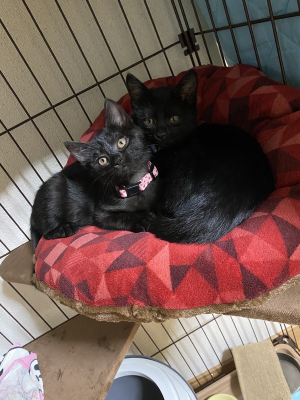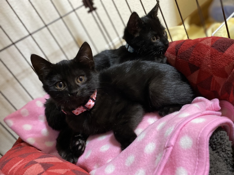 | 特徴(性格など) | オスはとても懐っこく、姿を見せるだけでゴロゴロ喜びます。 メスは少し臆病ですが引っ掻いたり噛むことはなく、慣れれば甘えて来ます。 2匹仲良しでいつも一緒に寝て、遊んでいます。 健康状態 先月27日に保護し検便検査で回虫がみつかり、治療中です。(21日に2回目のフロントライン薬投与です。) 軟便や下痢はありません。 2匹ともよく食べ、よく遊んで健康です。 |