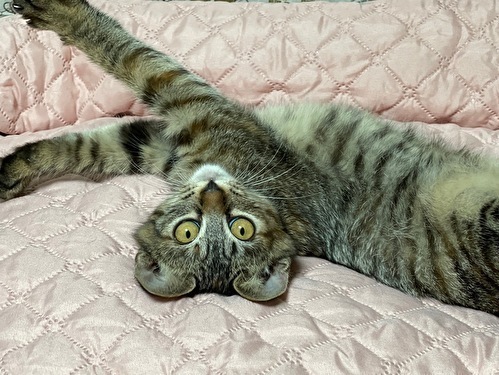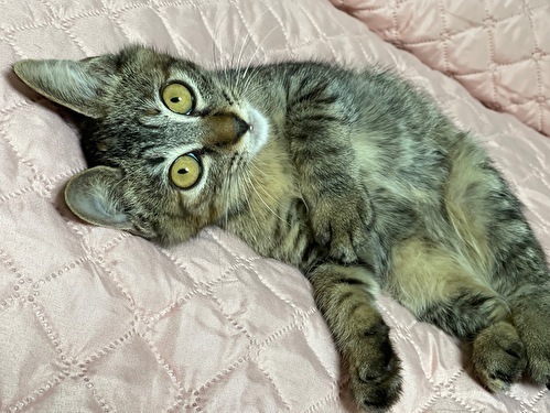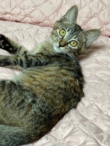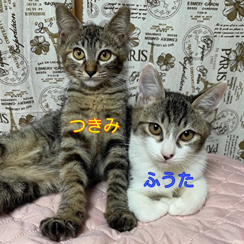 | 特徴(性格など) | 【仮名】つきみちゃん 【性格】怖がり4兄妹で保護された時は お猿さんのようにケージにしがみ付いていました(^_^;) が、人との生活にも慣れてきて撫でるとゴロゴロ♪ 喉を鳴らしへそ天になりアンヨが広がっちゃいます。 どんどんラブリ~♡にゃんこになって来ていますヨ!! 日々、兄妹のふうたくんといつも一緒に過ごしていますので 2匹一緒のお迎えを希望しています。 ※1匹譲渡不可 |