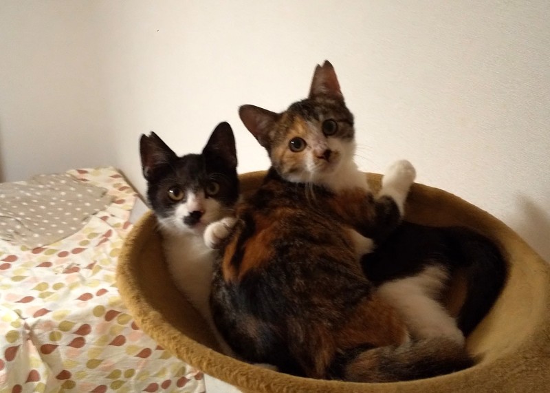| 特徴(性格など) | 3ヶ月後半の仲良し兄妹です。 ダッコをすると嬉しそうに喉をならします。 穏やかな子達で扱いやすいと思います。 保護した当時はヒビリちゃんでしたが日に日によい子になりました。 三毛ちゃんは健気そのものです。 モリモリ食べて仲良く元気に遊んでいます。 只今 健康状態は良好です。 ●健康診断済み ●不妊、去勢手術済(小さく耳カットあり) ●ウイルス検査(白血病とエイズ)マイナス ●3種ワクチン1回済み(9/26) ●便検査済み 駆虫 投薬済み ●2匹ともに現在約1.8kgです。(10/12現在) |