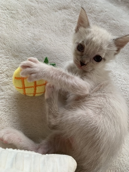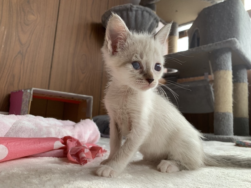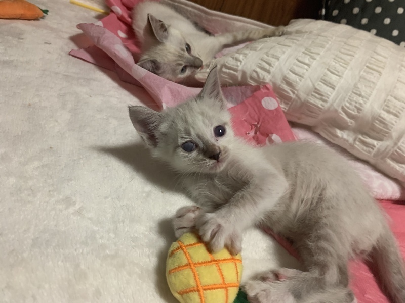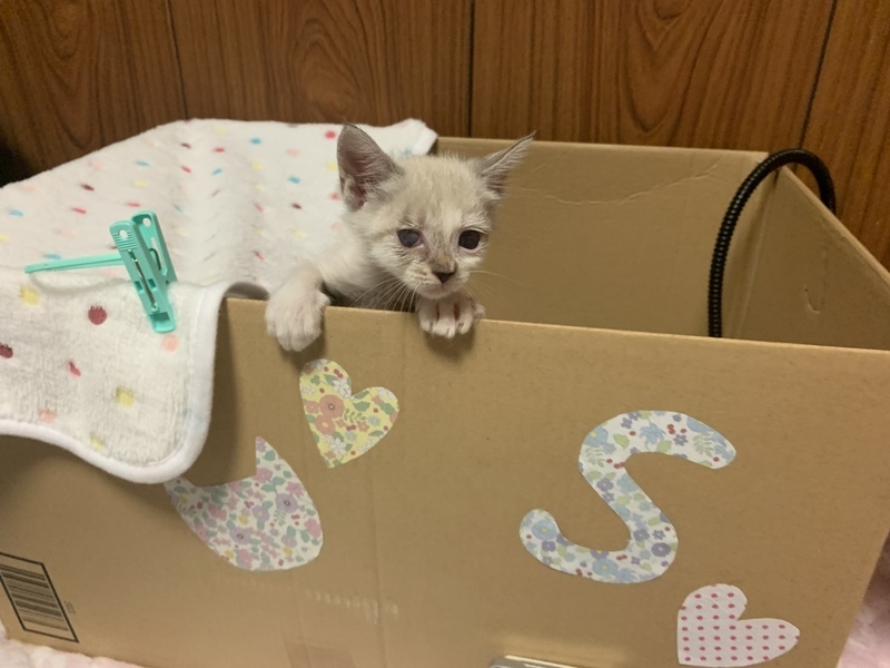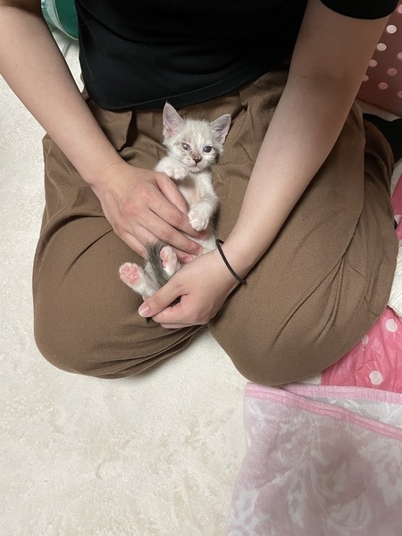 | 特徴(性格など) | 小さなからだにかわいさがぎゅっと詰まってます。 シャムミックスの男の子です♡ 生まれつきなのか、体は小さめです。 性格的にも甘えたちゃんで寂しがり。赤ちゃん感が抜けないところが可愛いです。 この度、一緒に保護された少し月齢の上の猫たち2匹が里親さんのところへ引越しました。 大好きなお兄ちゃん、お姉ちゃんががいなくなり寂しがっています。 ですので、なるべく早く、この子を可愛がってくれる優しい家族と出逢い、いっぱい愛されて幸せになってほしいです。 小さな体で遊ぶのも食べるのも全力です。 体は小さくても度胸があり、 小さな巨人とは小ちゃんのこと。 そしていっぱい遊んだ後は、コテンと寝落ちします笑 とっても甘えん坊で人懐こいです。 遊ぶ姿や寝姿にとても癒されます。 ほんとうに贔屓目でなく可愛い子で、 家族にいっぱい愛情と幸せをもたらしてくれる子だと思います。 保護直後はネズミちゃんみたいに小さく、ケージのバーの間を通り抜けられる"脱獄アーティスト"でした(笑) ミルクをぐびぐび飲んで成長しました。現在体重800gくらいです。離乳食と合わせて、カリカリを食べられるようになってきました。 ●月齢:推定8週齢くらい ●男の子 ●健康状態:良好 赤ちゃんの時の結膜炎の後遺症で、右目の角膜に濁りがあります。右目はうっすらとグレーですが、まあるいおめめは健在です。左目は問題なく、普通の家猫として生活する分にはまったく支障がないと獣医に診断されています。 ●トイレ指定の場所でちゃんとできます。 ご縁を感じる方、この子を家族として迎えて大事にしてくださる方、ぜひご連絡ください! |