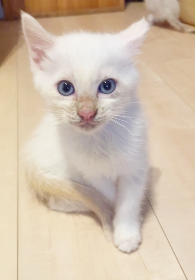 | 特徴(性格など) | 人懐こく目がブルーでとっても素敵な猫ちゃんです。生後3週齢位「9月20日頃生まれ」 |