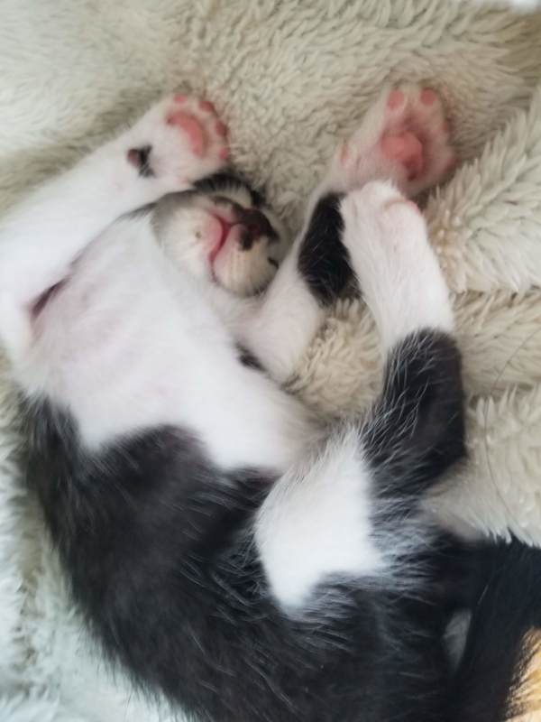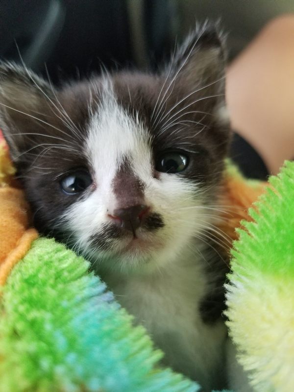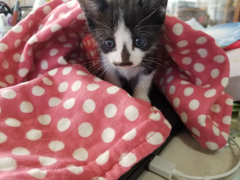 | 特徴(性格など) | 我が家のベランダに置き去りにされていました。 生後一ヶ月半くらいです。 グレーと白のバイカラー、鼻先の模様がユニークです。 性別はおそらく女の子。 人なつっこく、元気いっぱいです。 走れるようになったばかりで広い場所をぴょんぴょん走り回っていますが、ケージやキャリーケースに入っている時はおとなしくしているか寝ています。おなかが空くと騒ぎます。 |