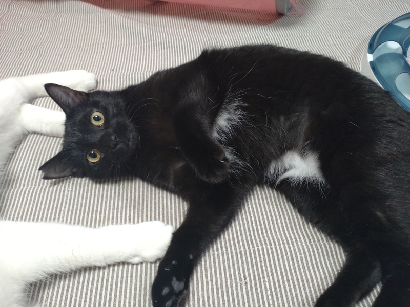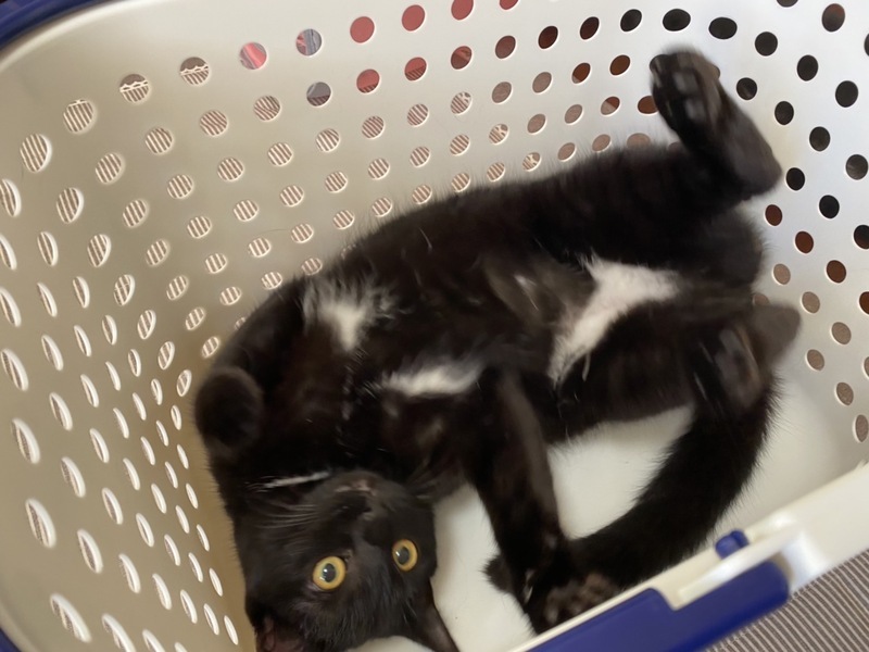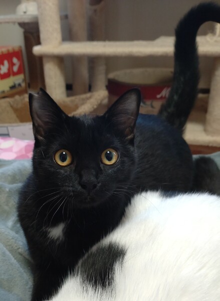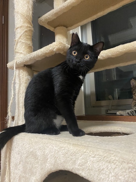 | 特徴(性格など) | 好奇心旺盛でおもちゃ大好きっ子です。 生後半年くらいでの保護だった為、まだ少し人に警戒していますが大人しく触らせてくれます。 ちょっとずつ自分から近寄って来てくれるようなりました。 他の子猫や大人の猫とも仲良くしています。 首、胸、お腹に白い模様の入ったクリクリな目をした美人さんです。 |