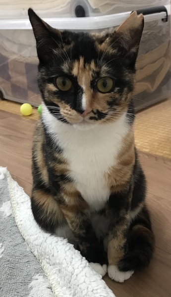 | 特徴(性格など) | 白少なめの三毛 おっとりさん、ツンデレ、時々おてんば、気の強い一面あり ひとりでいるのが好きなようですが、他の兄弟とも仲良く遊んでいます 甘えたの兄弟に押されていますが一対一では遠慮ぎみに甘えます あまり動じません、抱っこと爪切りは苦手 |