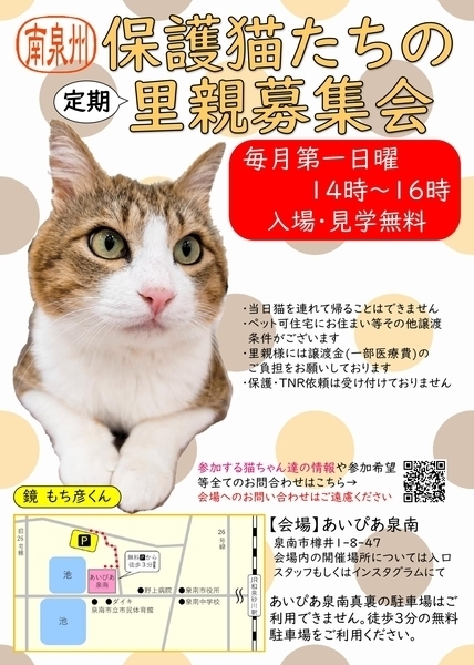 | その他(譲渡条件など) | ご足労ですが里親会場にお越しください。 会場にて面談をして頂きます。 申し訳ありませんが条件によりご希望にそえない場合もあります。 完全室内飼い、必ず脱走防止対策をお願いします。 ペット飼育可能なお住まいであること。 年齢は60歳まで。単身者不可。 せんなん猫の会 https://hogonekosatooya.fc2.net/ |