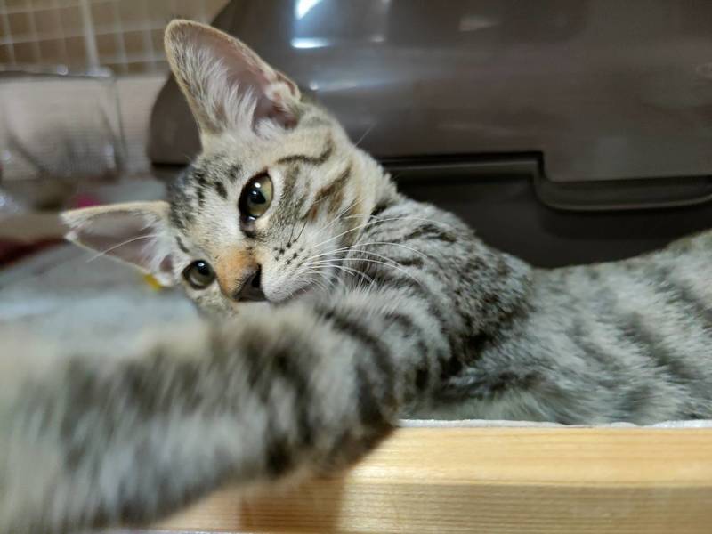 | 特徴(性格など) | 保護翌日の去勢手術当日からゴロゴロスリスリして、とてもよく甘えてきます♡ 他の猫や犬とも仲良くでき、お外にいたとは思えないほど懐っこい性格です(*'ω'*) 遊ぶのが好きですが、トリッキーな動きをして遊びます♪ 兄妹の中では一番マイペースでボケーっとしてる性格です♪ |