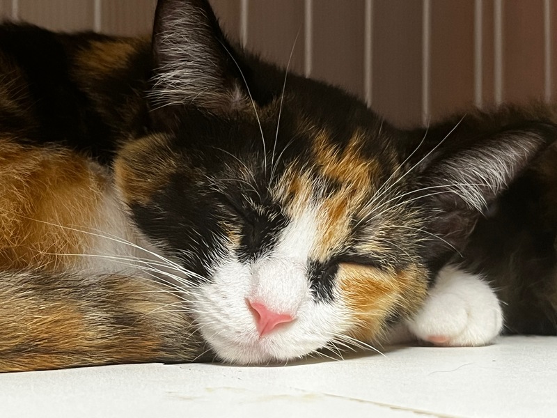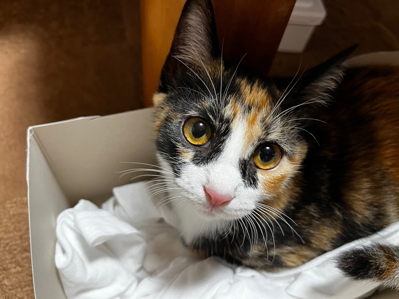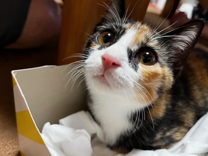 | 特徴(性格など) | ミケ猫の女の子です。 「サビ猫の女の子です。」の妹です。 姉妹で走り回ってお転婆ですが普段は甘えん坊です。 |