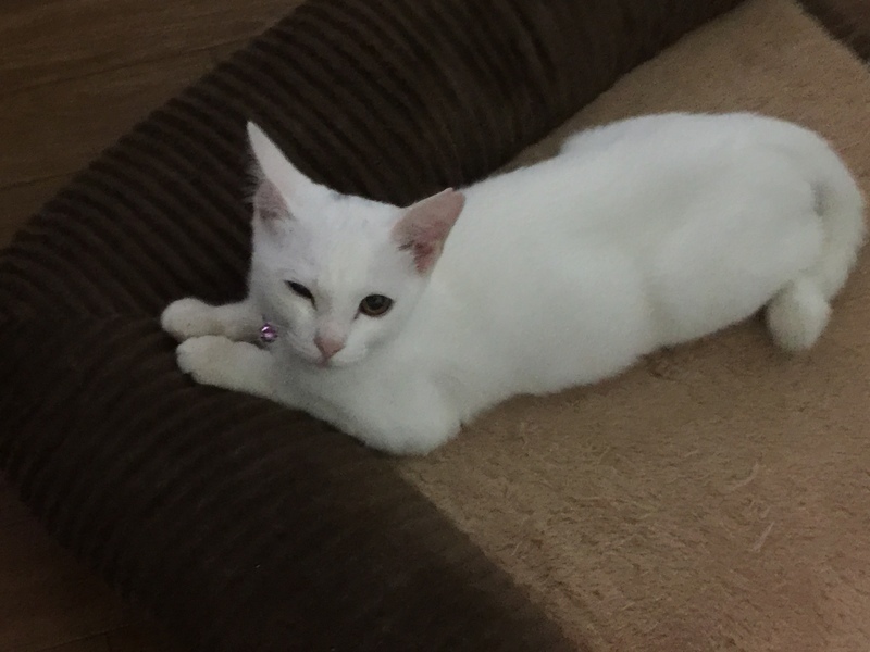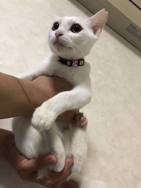| 特徴(性格など) | 小柄な可愛い白猫ちゃんです 3回曲がっているため尻尾の動きが特徴的です 少し怖がりさんですが抱っこするとゴロゴロと甘えてきます まだ完全に懐いてはいませんが、長い目でみてくださることを願います 先住猫さんのお友達としてはとても良い仔です |