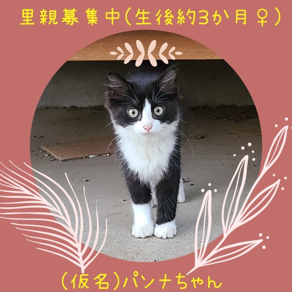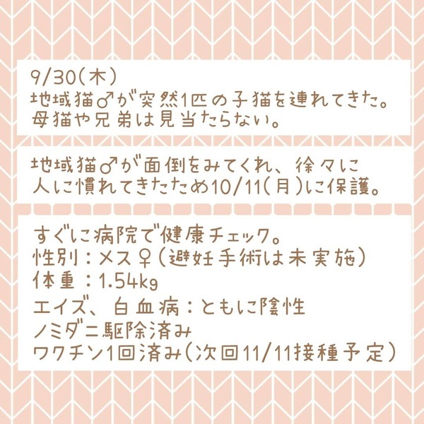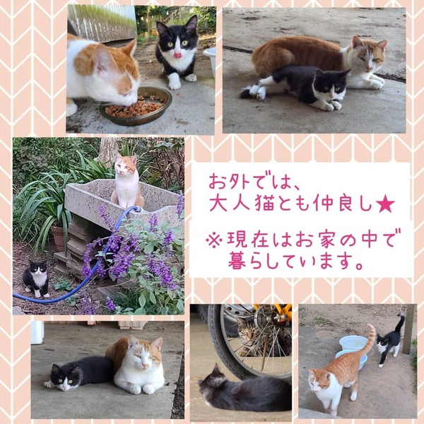 | 里親募集する理由 | 実家の庭に突然1匹で現れました。地域猫♂が世話をしてくれて人慣れしました。実家の両親は高齢のため最期までお世話する自信が無いため、里親募集します。 | ||