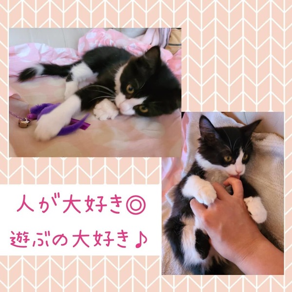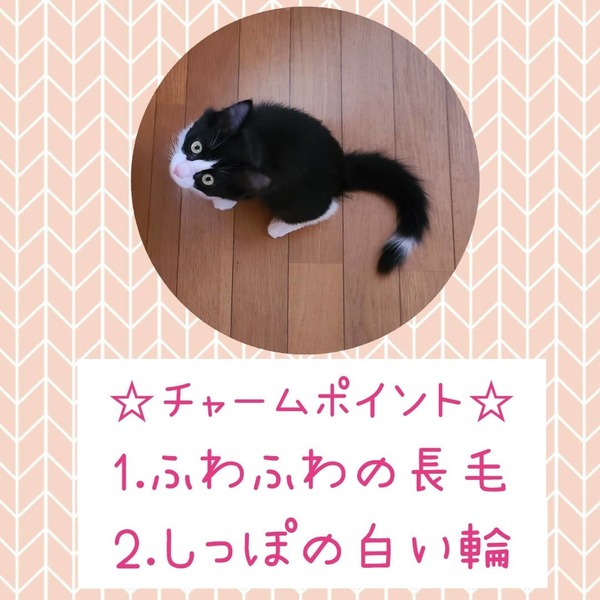 | 特徴(性格など) | 長毛のハチワレ柄で、しっぽに白い輪があります。 人にも猫にも慣れています。走り回ることが大好きで、皆を遊びに誘います。エイズ陰性、白血病陰性。 |
