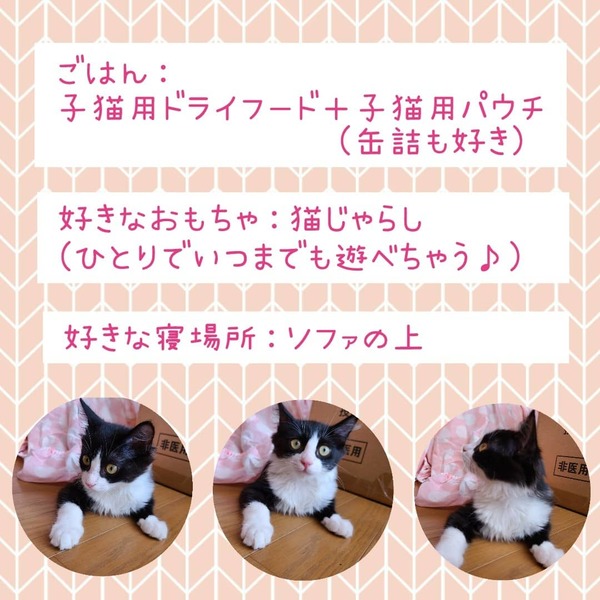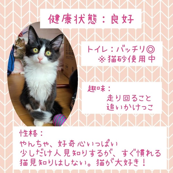 | その他(譲渡条件など) | 譲渡条件 ・単身者、高齢者は不可 ・完全室内飼育 ・終生飼育 ・避妊手術(生後6か月以降に実施) ・年1回ワクチン接種 |