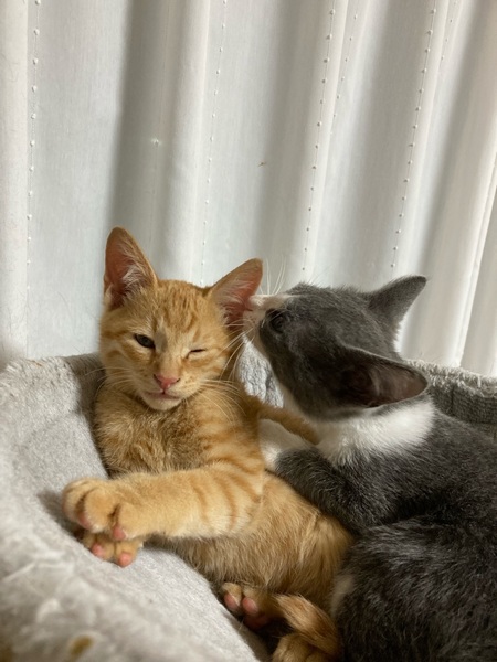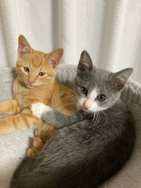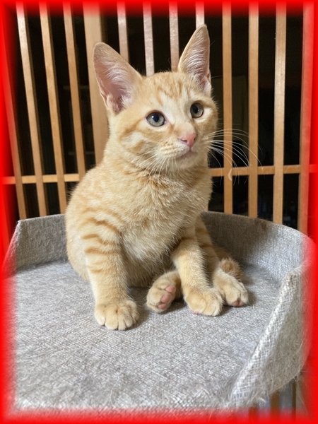 | 特徴(性格など) | 仮称…ポン太 2ヵ月位の茶トラ男の子です。 食欲旺盛、元気いっぱい丸々ニャンです。 のんびり&おっとり男子で抱っこも好きみたいです♪ 別で募集しているグレー白の「ケン太」と仲良く走り回っています。 2人一緒のご縁を希望しております。 ・レボリューション(駆虫薬)滴下済 ・便検査済 ・ワクチン1回目済み |