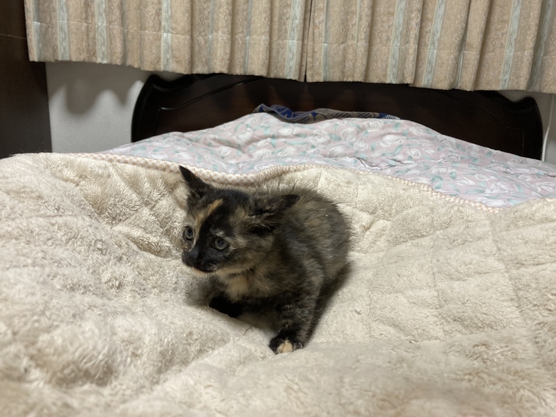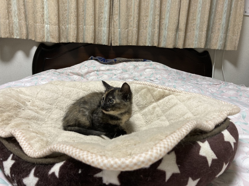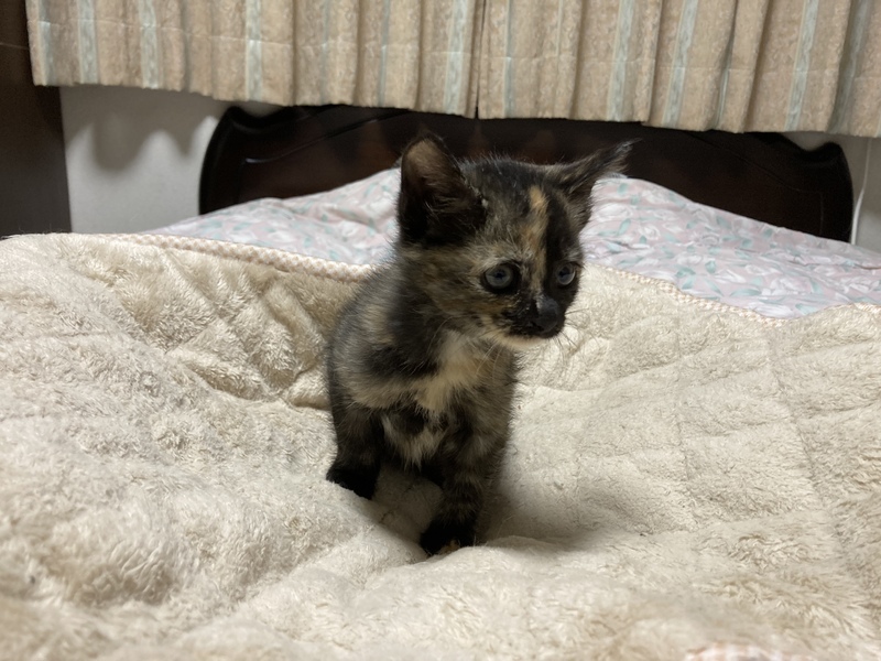 | 特徴(性格など) | 色柄は少し淡いサビ色。真っ直ぐ尻尾でちょっと垂れ目の女の子。食欲旺盛です。母猫はエイズ陰性、白血病陰性。 | ||