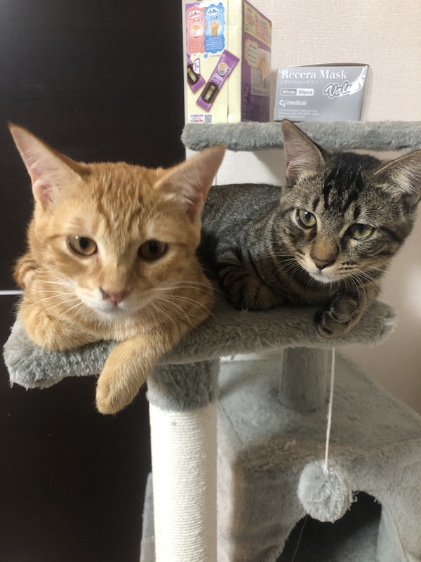 | 特徴(性格など) | 茶トラちゃん 食い意地旺盛、気がつけばカリカリを 食べてます ヤンチャで好奇心旺盛でよく暴れ回っておりますが甘えたで寝る時はいつも撫でてと擦り寄ってきます キジトラくん とてもクールで普段は大人しいです ですが1度スイッチが入ると暴れまくります 茶トラちゃんとは違い気まぐれに甘えてきます |