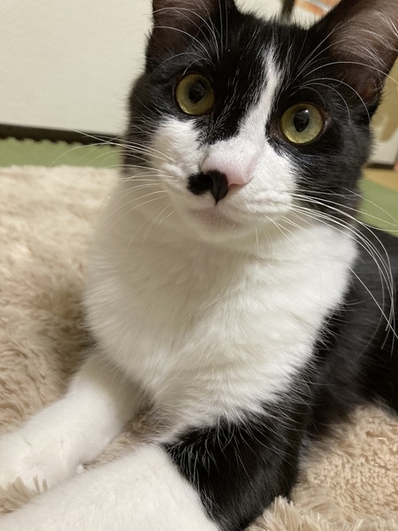 | 特徴(性格など) | 白黒ハチワレの男の子(^^) 中毛のふさふさくんです^ ^ ちょっとビビリですが、ご飯ちょーだいと私の足にスリスリしたり、遊んでる時に私を盾にしてかくれんぼしたり… それに気がつくとビックリして逃げる!!いつも一人でコントしています^ ^ |