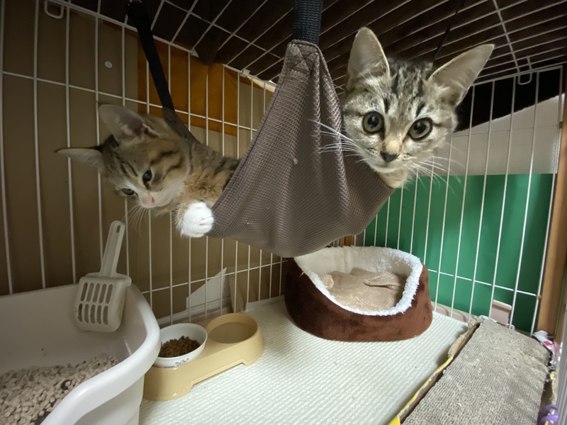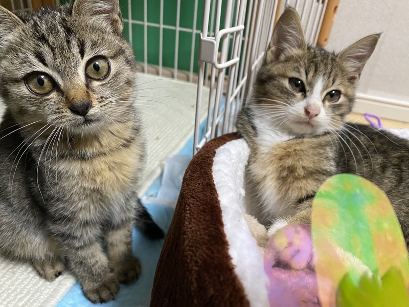 | 特徴(性格など) | お兄ちゃん(仮) キジトラちゃんでお口周りがしろく ピンクのお鼻が可愛いです! 妹ちゃんよりは警戒心がうすく 今のところはお利口さんです! 妹ちゃん(仮) 全身キジトラ真っ黒なお鼻です 警戒心が強く怖がりです 慣れると顎の下を撫でられるのが好きで顎を差し出してきます♪ |