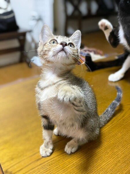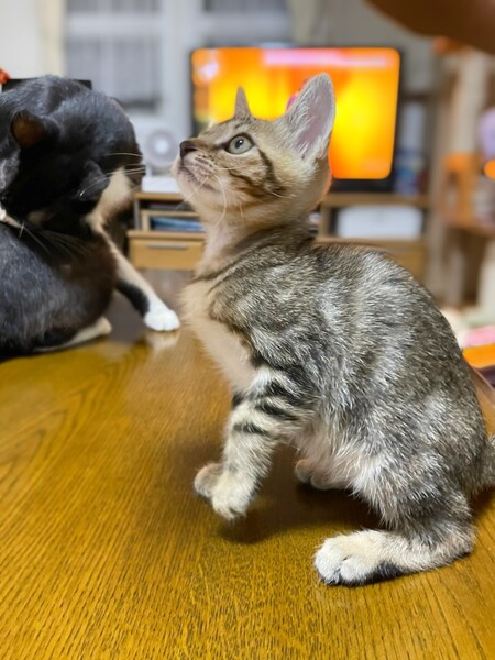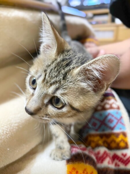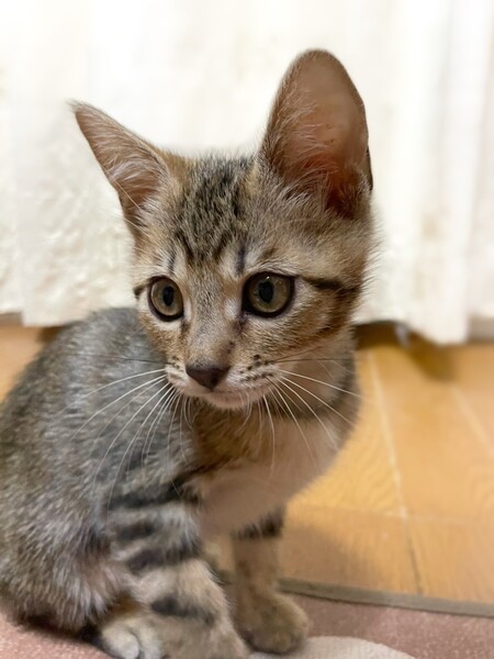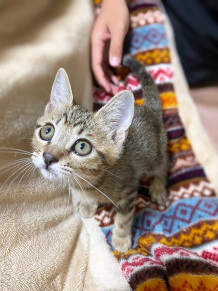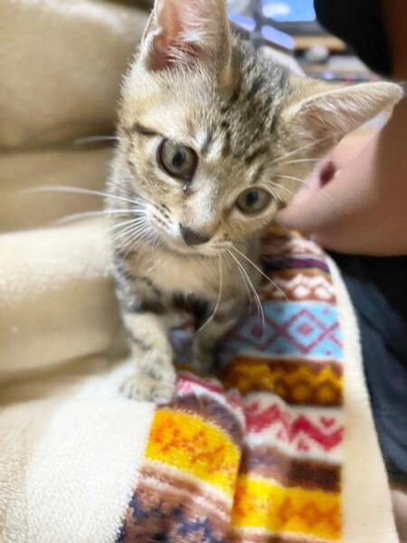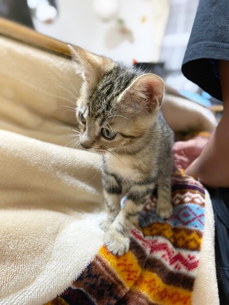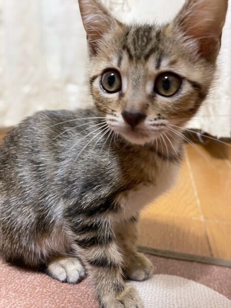 | 特徴(性格など) | 6匹兄妹で保護されました。1匹は力及ばずでしたが、5匹は元気に育っています。 つきちゃんは兄妹の中でも女の子だけど超やんちゃですww 皆、よく食べよく寝て、よく育っています。 キジトラの、かわいいつきちゃんに、ぜひ会いに来てください(^^) ・ノミダニ回虫駆除済み ・エイズ、白血病検査予定 ・3種混合ワクチン接種予定 |