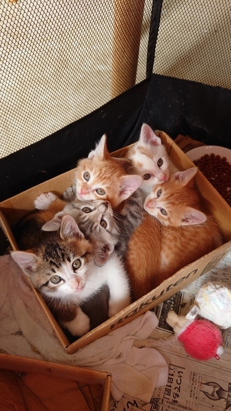 | 特徴(性格など) | 〖里親様決定〗 ①(メス)キジトラ柄に白と茶色が混ざった柄の子です。尻尾の先が少し曲がっています。 保護した頃は1番警戒心が強い子で、目が合うだけでも威嚇してきました。 まだ怖がりな所もありますが、触っても威嚇等しなくなりました。 ②(オス)グレーと黒が混ざった柄の子です。 尻尾が少し短いです。1番人慣れしている子です。 皆大きい音に怖がっている中、この子だけ落ち着いてる事がほとんどです。 〖里親様決定〗 ③(メス)茶色と少なめの白色の柄の子です。 尻尾がかなり短いです。 まだ人に慣れていないところがありますが、最近では人と遊ぶことにも興味を示しています。 ④(メス)白色に少し茶色が混ざった柄の子で、尻尾が①の子の柄と似ています。 最初は寝ていることが多かったですが、最近は他のこと遊ぶことも多くなってきました。 控えめな性格かと思います。 ⑤(オス)色や柄は③の子と似ていますが、こちらの子の方が少し白が多く、尻尾が長いです。 最初あった威嚇はなくなりましたが、まだ慣れていないところが多いです。 猫エイズキャリアです。 ③の子が最初里親様が仮決定してましたが、里親様の方で血液検査をしたところ猫エイズ陽性が出ました。 結果里親様の方に先住猫さんがいるためお断りという形となりました。 もう1匹の子も里親様が仮決定してましたが、エイズの可能性があると伝えたところお断りということになりました。 |