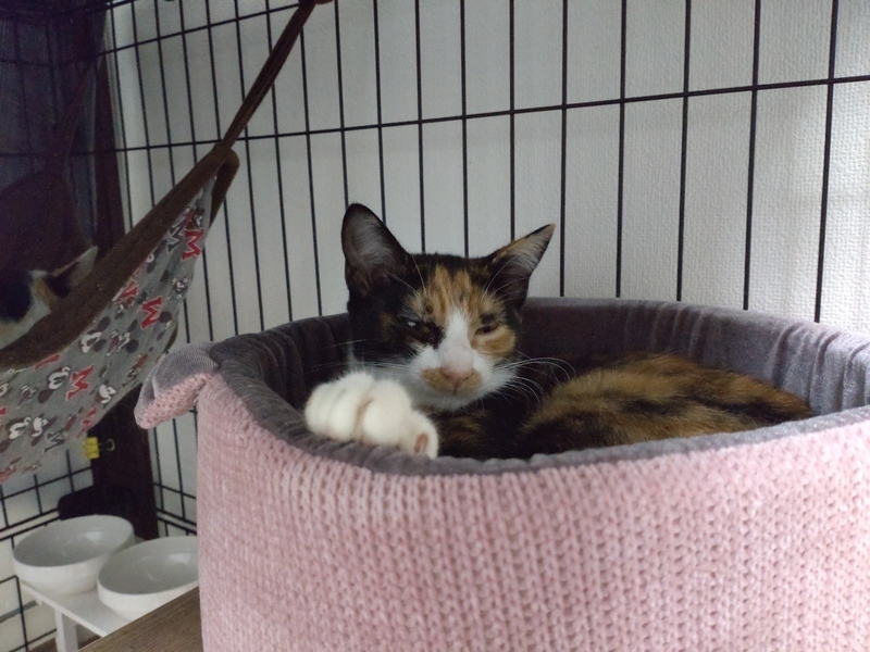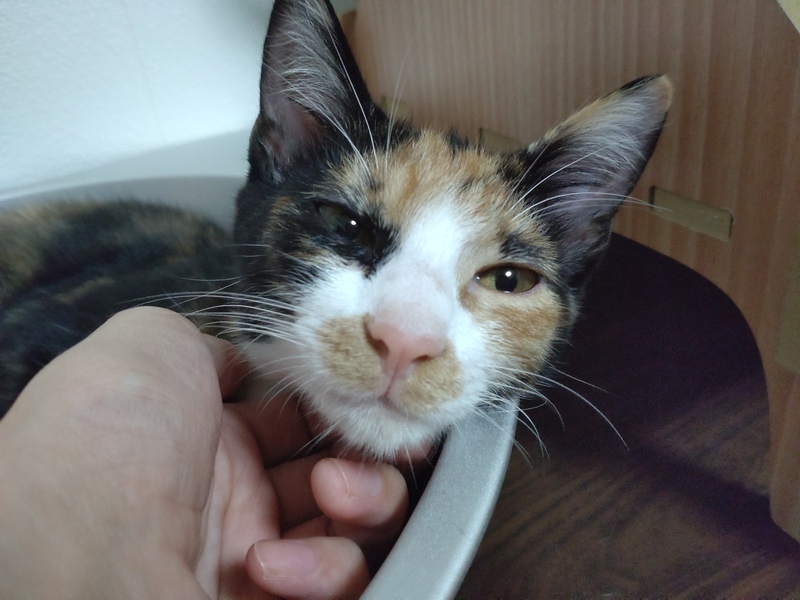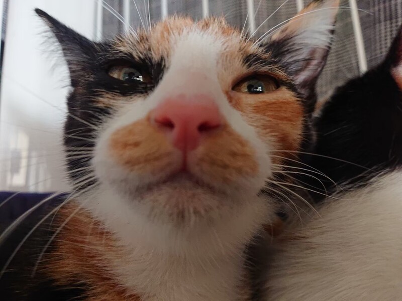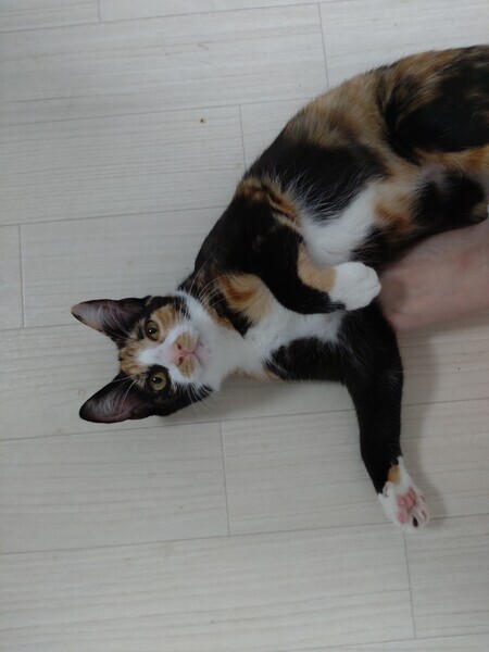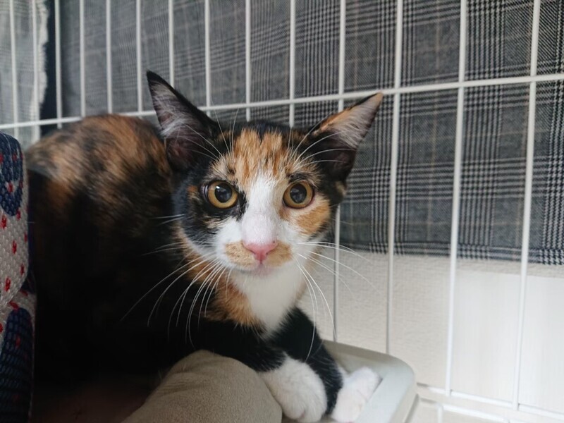 | 特徴(性格など) | 2021.4.6生まれ(推定) 毛色:三毛 左は片眉毛、右目は隈取、お口まわりは泥棒さん!? とっても個性的な、三毛猫 はなび。 上半身は黒多め、足には茶トラ模様の入っている、素敵な三毛柄をしています。 しっぽはスラッと長くて、鍵しっぽ♪ 遊ぶの大好き!食べるの大好き!元気いっぱいの女の子です。 ビビリさんですが、心を開いたら甘えん坊炸裂!!! 喉をゴロゴロ鳴らして、スリスリが止まりません♡ 姉妹のまつりをナデナデしていると、私もー!!と前に割り込んできちゃいます。 慣れれば抱っこもOKですが、自分が甘えたい時じゃないと逃げてしまうことも。 ゆっくりと、はなびのペースに合わせてくださるような里親様と 出会えたら嬉しいです!! |