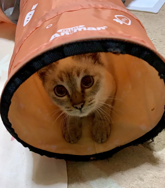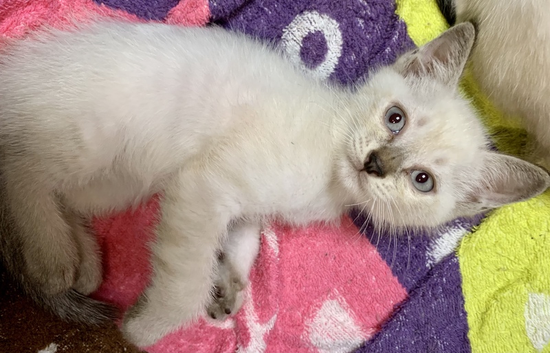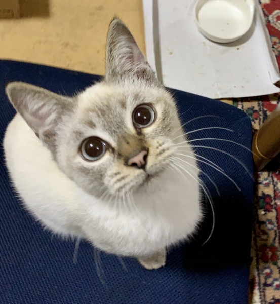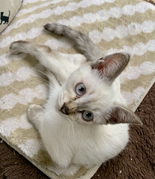 | 特徴(性格など) | 交通事故なのか理由は不明ですが、踵骨骨折により左後脚を庇う歩き方をしている時期がありましたが、今では走り回ることもあります。 また尻尾の付け根付近の骨折もあり、尻尾は動かせなく排尿障害があるため、1日3回の圧迫排尿が必要です。 大便の方は自然排出になってしまいます。 遊ぶのは大好きなようで猫じゃらしで遊んだり、兄妹猫と戯れたりします。 見た目はシャムに似ており、青い目をしています。 足先と鼻、耳が黒っぽく、尻尾は真っ直ぐでしま模様です。 成長とともに顔つきが変わり、顔も黒っぽくなってきました。 保護当時と現在の写真を載せています。 ご飯は、尿が詰まらないように獣医に勧められたユリナリーS/O ドライを与えています。 動物病院で血液検査した結果、全て陰性でした。 |