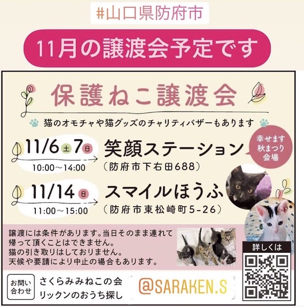 | その他(譲渡条件など) | 11月6日(土)7日(日)に防府市右田の「笑顔ステーション・幸せます秋まつり」で開催予定の保護ねこ譲渡会に参加予定です。詳しくは譲渡会情報をご覧ください。可愛い子達に会いに来てくださいね。 【猫の里親を希望される方は、以下の譲渡条件のご確認をお願いいたします】 ●終生、責任と愛情を持って、大事な家族として育てて頂けるようお願いします。 ●一戸建て住宅またはペット可物件にて、完全室内飼育でお願いします。 ●猫を迎えることにご家族全員の承諾をお願いします。 ●お引き取り後はワクチン、ノミダニ駆除、避妊など、定期的に医療ケアをお願いします。 ●譲渡後も無理のない範囲でかまいませんので、成長の様子をご連絡頂きますようお願いします。 ●引き渡しの際に身分証明などを提示し、誓約書への署名をお願いします。 ●トライアルはご自宅にお連れしますので、往復の交通費のご負担をお願いします。 ●高齢者・単身者世帯の方は、60歳以下の後見人が必要となりますので、先に後見人さんの了解を得てからのご応募をお願いします。 ●初めて猫を飼う方は、ご家族に猫アレルギーがないかご確認ください。 |