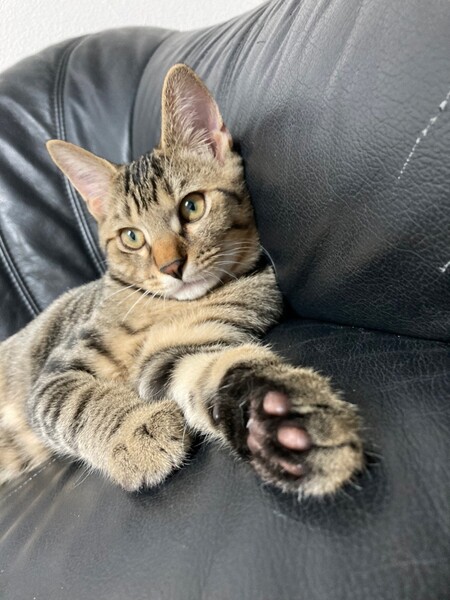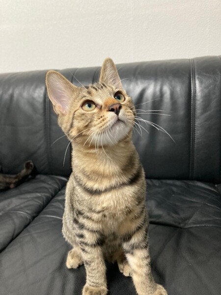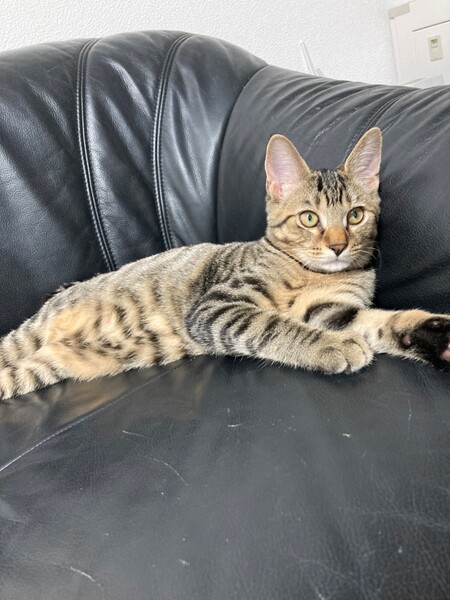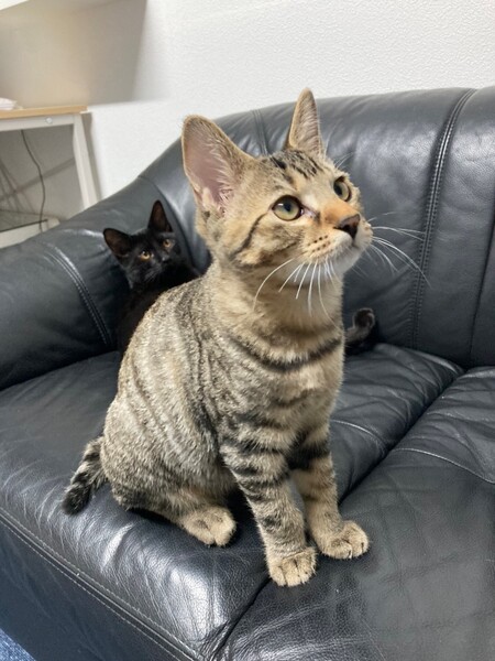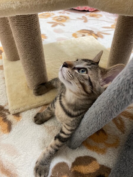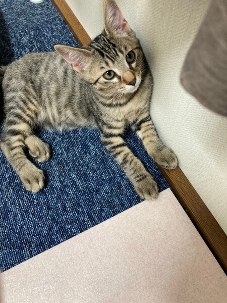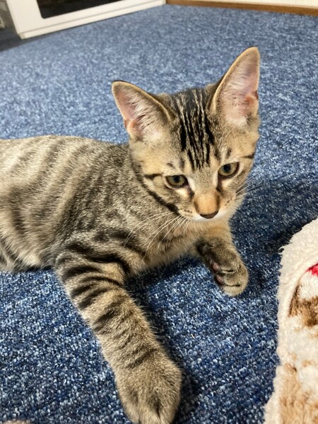 | 特徴(性格など) | 2021.7.1生まれ(推定) 毛色:キジトラ シャイな性格の男の子。 皆んなのあとからそっと様子見、遊び出したら夢中です♪ 食欲も旺盛。 撫でればゴロゴロ♡ しっぽは幸運の鍵しっぽ。 パッとは飛んでこないけどいつのまにか横に ちょこんと座ってくれてるタイプの男の子です♡ |