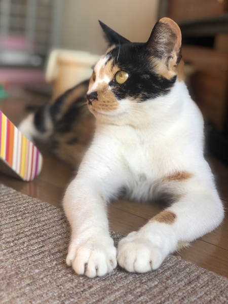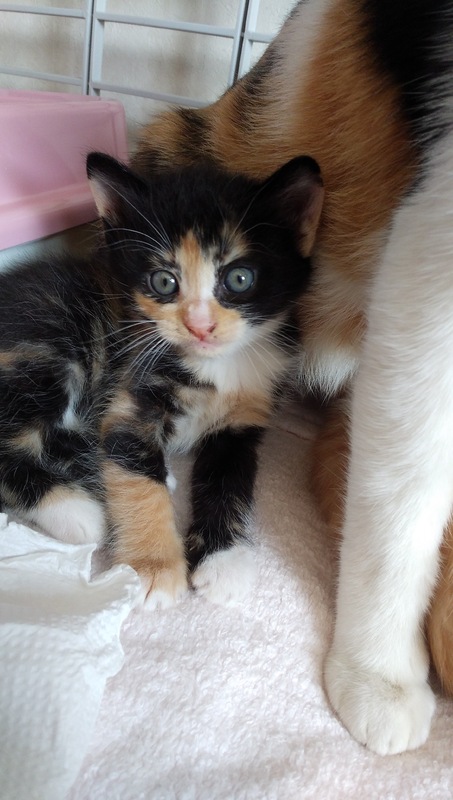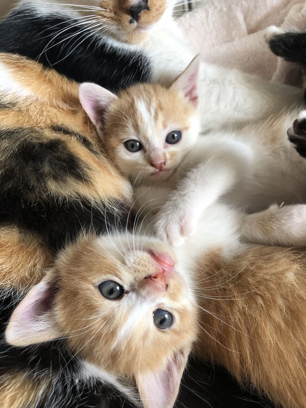 | 特徴(性格など) | お母さん(三毛猫 推定1-2歳) とっても穏やかでものわかりのいいおりこうさんなお母さんです。爪切り、抱っこ、病院(採血など侵襲のある処置)シャンプー、おりこうにできます!子育ても上手にしています。外を眺めるのが好きですが、網戸にしていても外に出たがるような仕草はありません。知らない人がきても隠れるなどはなく、物おじしない猫さんです。爪研ぎ、トイレ上手にできています。 子猫たち(推定2ヶ月) 三毛猫(メス) 3頭の中で1番甘ったれかと感じます。膝に乗せてと甘えて抱っこで寝てしまいます。 茶白(茶色多め) 慎重派な感じです。 茶白(白多め) おっとりしています。 お母さん、エイズ白血病陰性です。子猫たちは3ヶ月すぎないと母親の抗体があり検査しても正確でないとのことで、未実施です。 鼻水めやに、嘔吐や下痢、目の混濁などの風邪症状なく元気です。 |